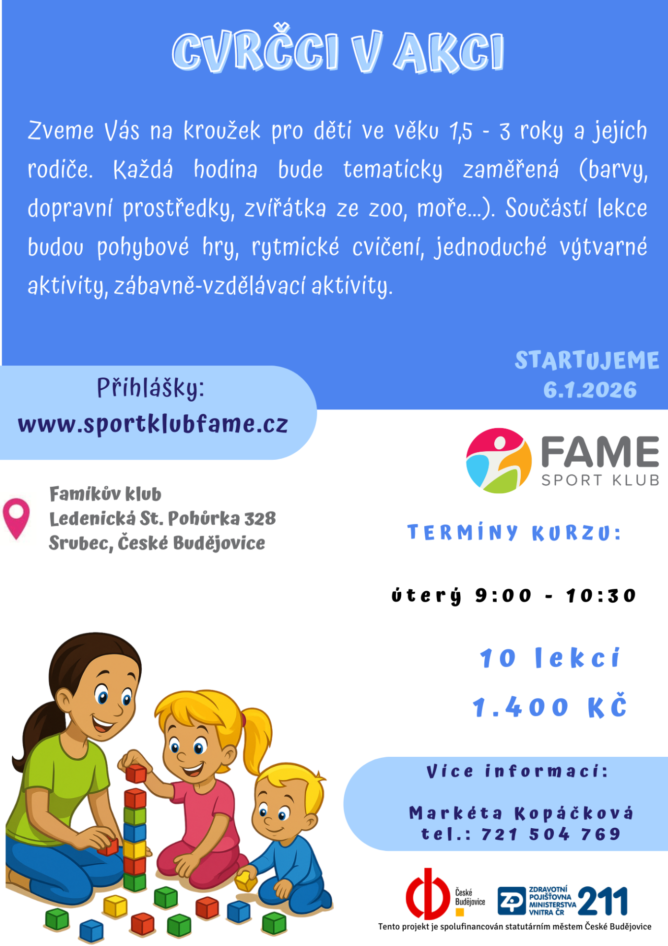 Po úspěšném prvním pololetí jsme pro Vaše děti ve věku 1,5 - 3 roky připravili pokračování kroužku "Cvrčci v akci". Jedná se o kroužek, který kombinuje pohybové hry, rytmické cvičení, jednoduché výtvarné aktivity a zábavně-vzdělávací činnosti. Každá hodina je tematicky zaměřená (barvy, dopravní prostředky, zvířátka ze statku, zoo ...). Kroužku se...