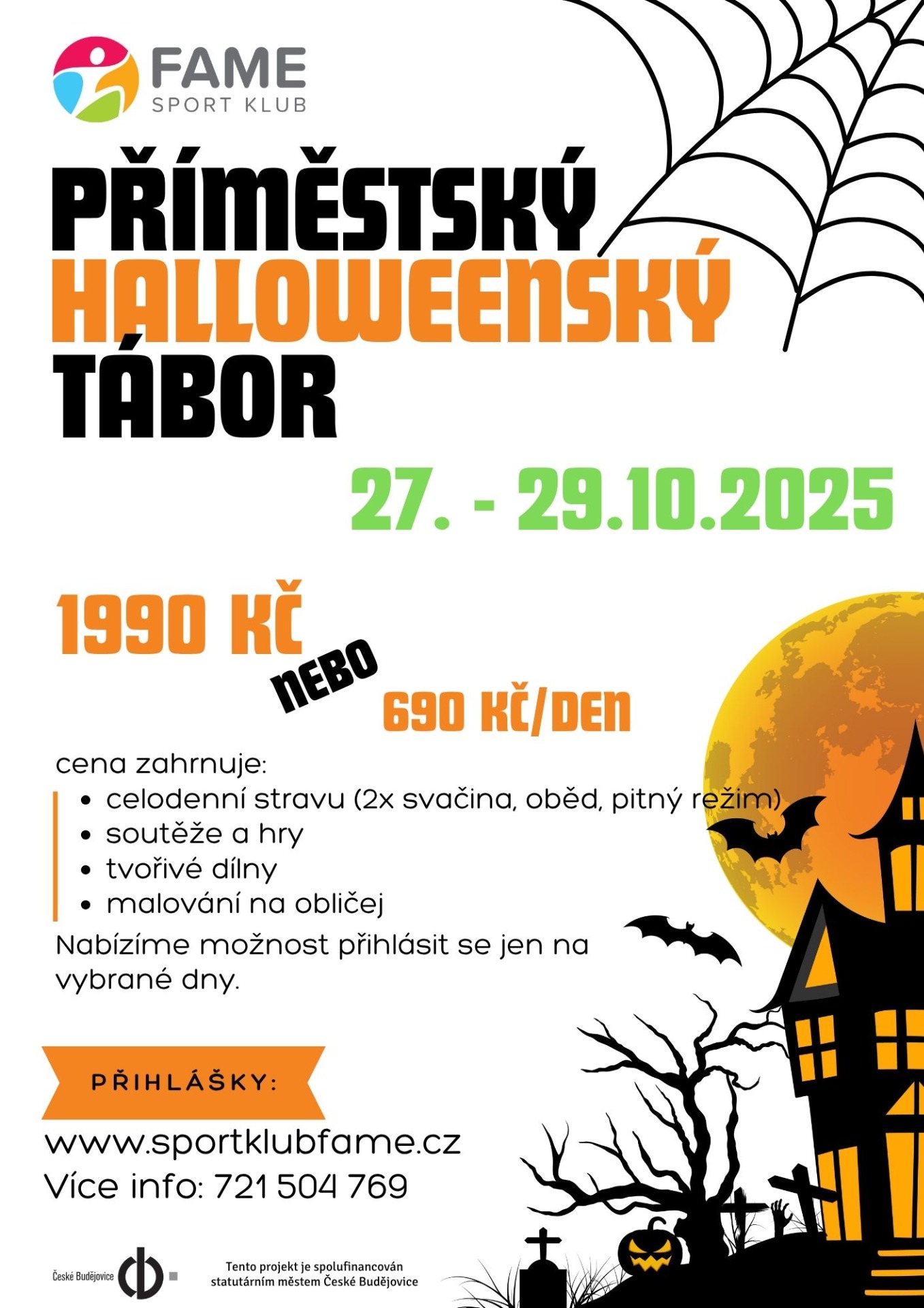 Podzimní prázdniny se blíží a my jsme pro Vaše děti připravili podzimní halloweenský příměstský tábor. Přihlásit se můžete za výhodnou cenu na všechny 3 dny volna nebo si vyberte jen dny, které se Vám hodí. Tábor je určen pro děti ve věku 4 - 12 let (pro mladší děti po domluvě).