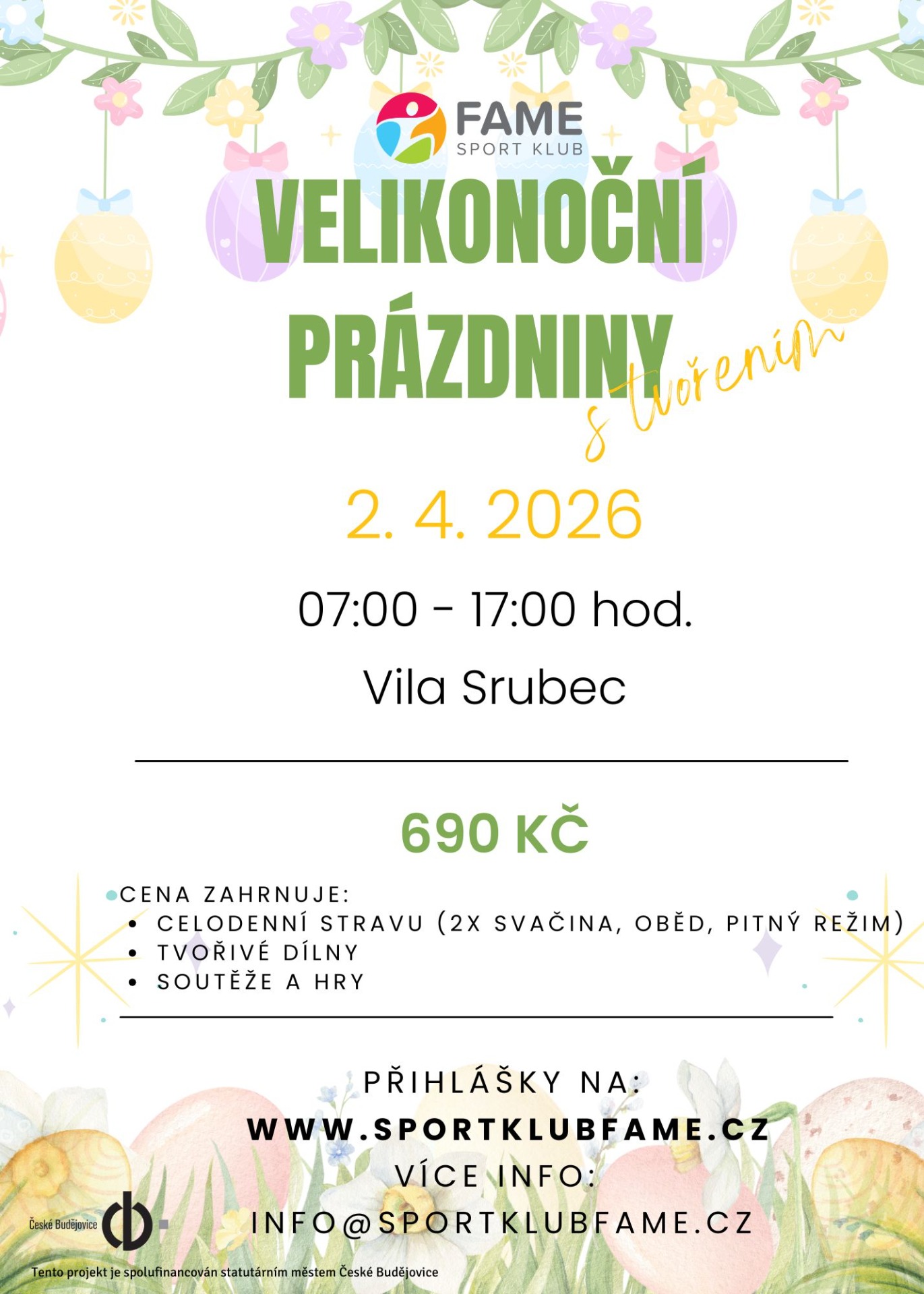 Ve čtvrtek 2. 4. 2026 pro Vaše děti chystáme velikonoční příměstský tábor. Akce je určena pro děti ve věku 4 - 12 let (pro mladší děti po domluvě).